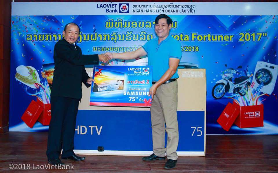The awards include 21 prizes, of which the biggest prize is the Toyata Fortunner All New, worth 400 million kip, belonging to the customer with a deposit code of AS177659 (Ms Buachin Keo Phila) and other prizes have been awarded to customers, as follows: