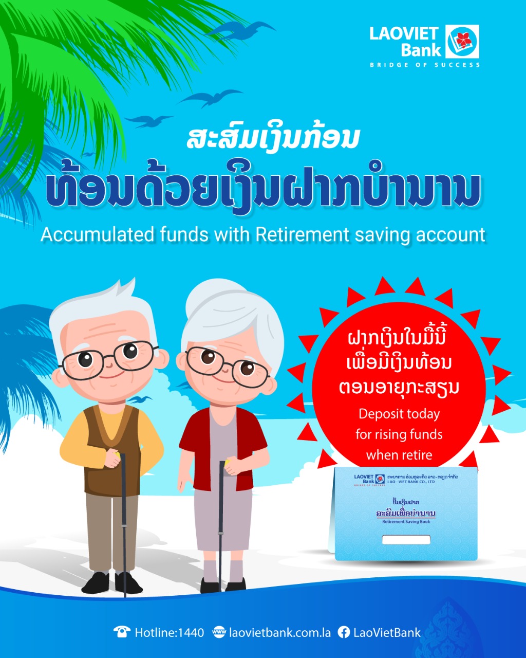 ສະສົມເງິນກ້ອນທ້ອນດ້ວຍເງິນຝາກບຳນານ ກັບ LaoVietBank ຝາກເງິນໃນມື້ນີ້ເພື່ອມີເງິນທ້ອນໃນຕອນອາຍຸກະສຽນ.