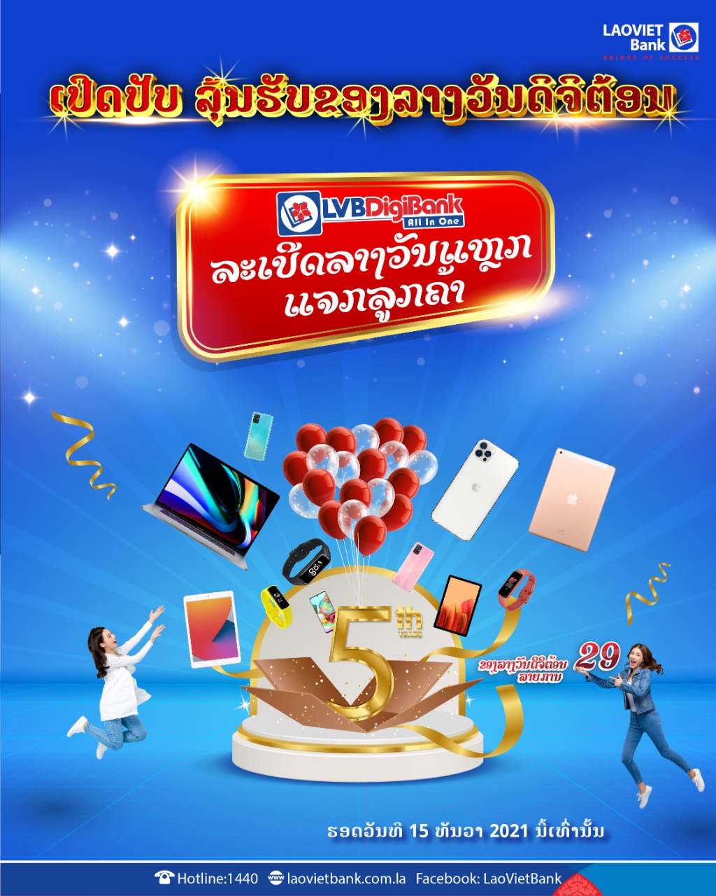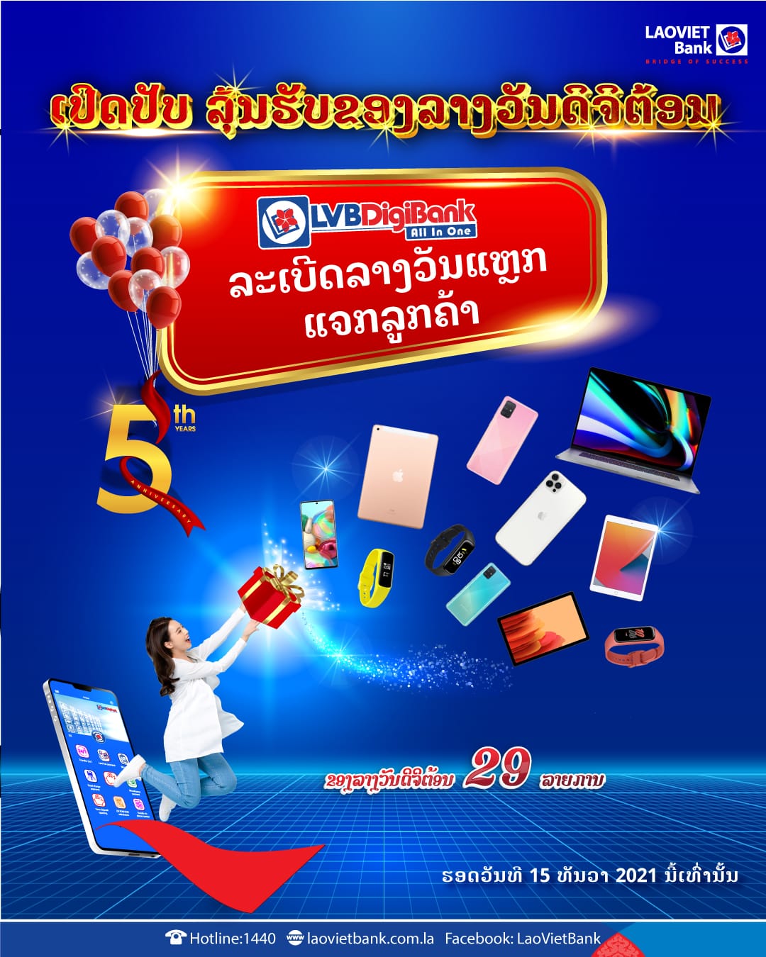 LaoVietBank ຂໍເຊີນທ່ານລົງທະບຽນນຳໃຊ້ LVB DigiBank ເພື່ອລຸ້ນຮັບຂອງລາງວັນດິຈີຕ້ອນເຖິງ 29 ລາຍການ.