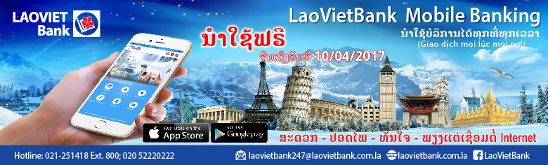 ໃນວັນທີ 10/01/2017 ທີ່ຜ່ານມາ LaoVietBank ໄດ້ເປີດນຳໃຊ້ບໍລິການທະນາຄານເທິງມືຖື LaoVietBank Mobile Banking (LaoVietBank SmartBanking ສຳລັບລູກຄ້າບຸກຄົນ ແລະ LaoVietBank Corporate Banking ສຳລັບລູກຄ້ານິຕິບຸກຄົນ). ເນື່ອງໃນໂອການເປີດໃຊ້ການບໍລິການໃໝ່ນີ້ ສຳລັບລູກຄ້າທີ່ລົງທະບຽນນຳໃຊ້ບໍລິການ LaoVietBank Mobile Bankin ຈະໄດ້ຮັບການຍົກເວັ້ນຄ່າທຳນຽມບໍລິການ ນັບແຕ່ວັນທີ 10/01/2017 ເຖິງວັນທີ 10/04/2017, ພ້ອມກັນນັ້ນຍັງໄດ້ຮັບສ່ວນຫຼຸດ 5% ເມື່ອເຕີມເງິນໂທລະສັບ ແລະ ສ່ວນຫຼຸດ 0.5% ເມື່ອຊຳລະໃບບິນໂທລະສັບ.