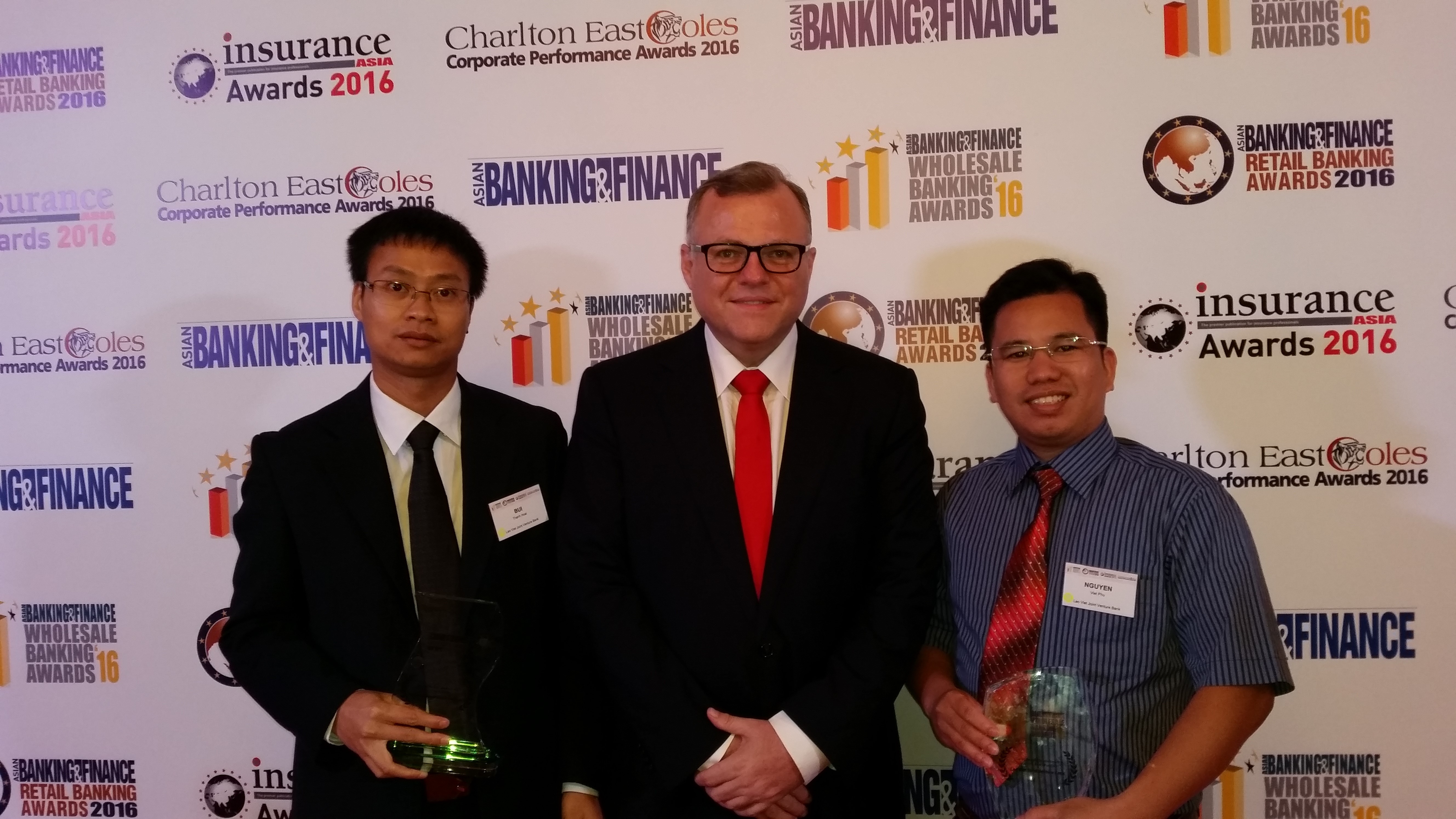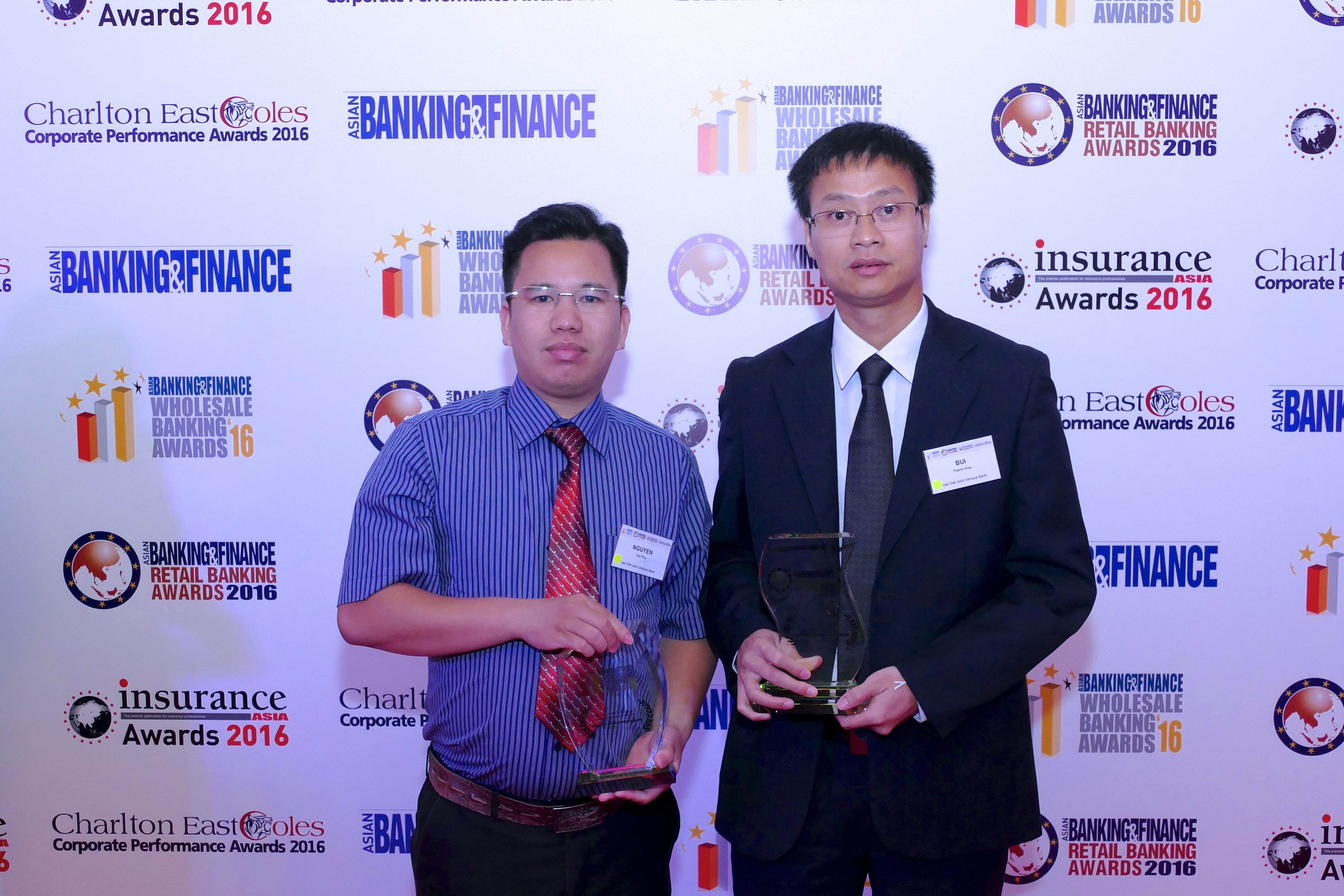 Trong đêm trao giải được tổ chức vào ngày 20/07/2016 tại Khách sạn Shangri-la, Singapore, Ông Bùi Thanh Hoài - Phó Tổng Giám đốc LaoVietBank và Ông Nguyễn Việt Phú – Trưởng phòng CNTT đã đại diện cho LaoVietBank vinh dự nhận các giải thưởng về CNTT từ Ông Tim Charlton – Tổng Biên tập tạp chí Asian Banking and Finnace.