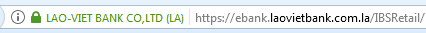 - Khi sử dụng máy tính để truy cập vào Internet Banking cần sử dụng máy tính riêng, không sử dụng máy tính nơi công cộng, không sử dụng máy tính dùng chung nhiều người. Đồng thời cần kiểm tra yếu tố bảo mật trên Internet Banking của LaoVietBank là: khi truy cập vào trang Internet Banking, trên ô nhập địa chỉ sẽ hiển thị biểu tượng chiếc khóa và chữ “LAO-VIET BANK CO,LTD (LA)” ở đầu dòng như hình dưới đây. Nếu không thấy biểu tượng chiếc khóa và chữ “LAO-VIET BANK CO,LTD (LA)” thì đó là trang giả mạo không phải của LaoVietBank.